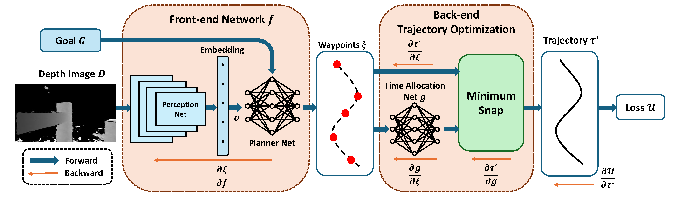 We propose a self-supervised UAV trajectory planning pipeline that integrates a learning-based depth perception with differentiable trajectory optimization. A 3D cost map guides UAV behavior without expert demonstrations or human labels. Additionally, we incorporate a neural network-based time allocation strategy to improve the efficiency and optimality. The system thus combines robust learning-based perception with reliable physics-based optimization for improved generalizability and interpretability. Both simulation and real-world experiments validate our approach across various environments, demonstrating its effectiveness and robustness. Our method achieves a 31.33% improvement in position tracking error and 49.37% reduction in control effort compared to the state-of-the-art.